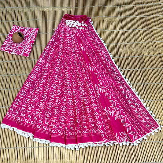 Printed Pure Cotton Mulmul Saree With PomPom Lace