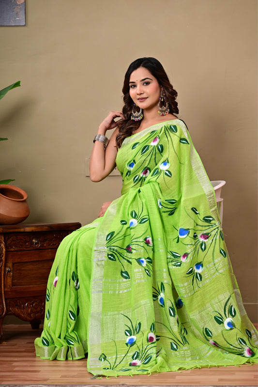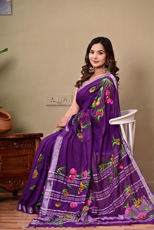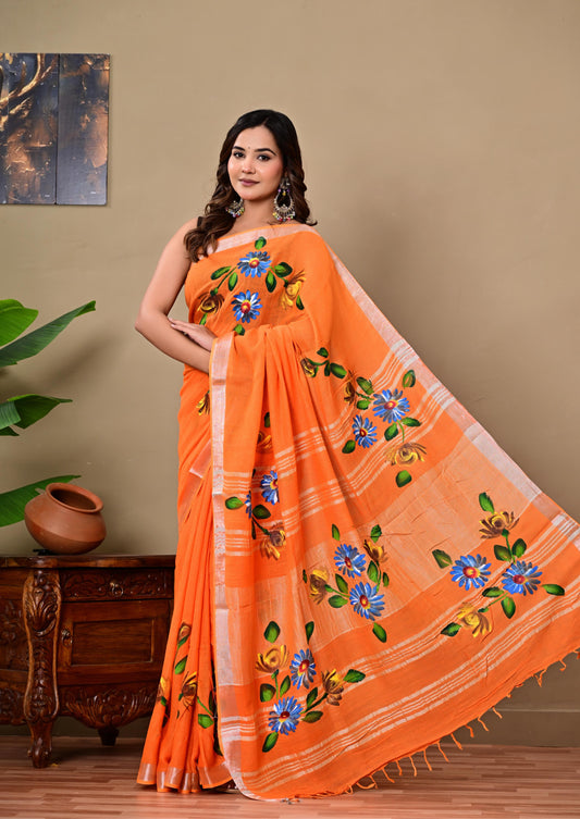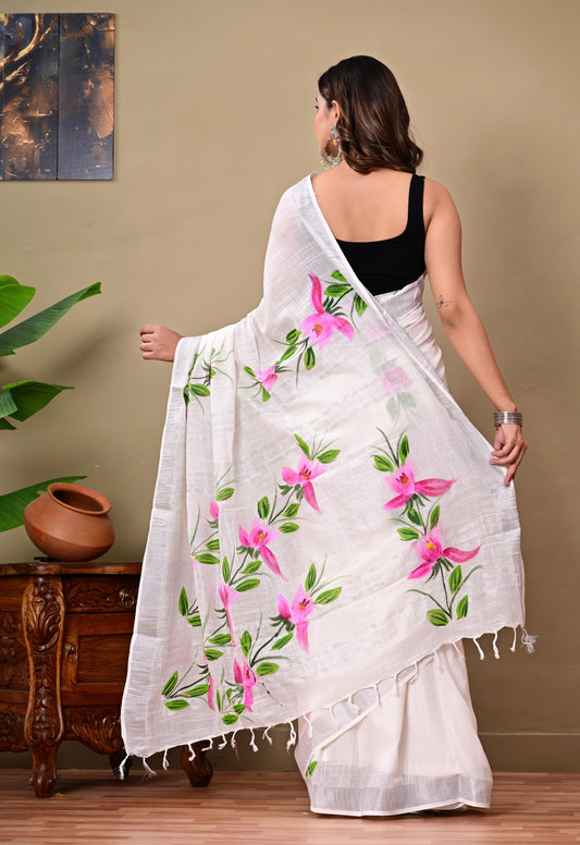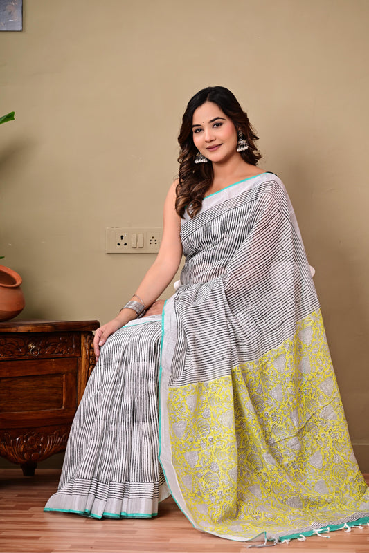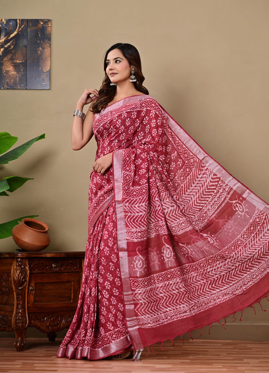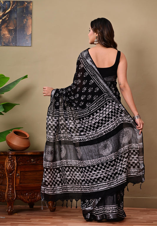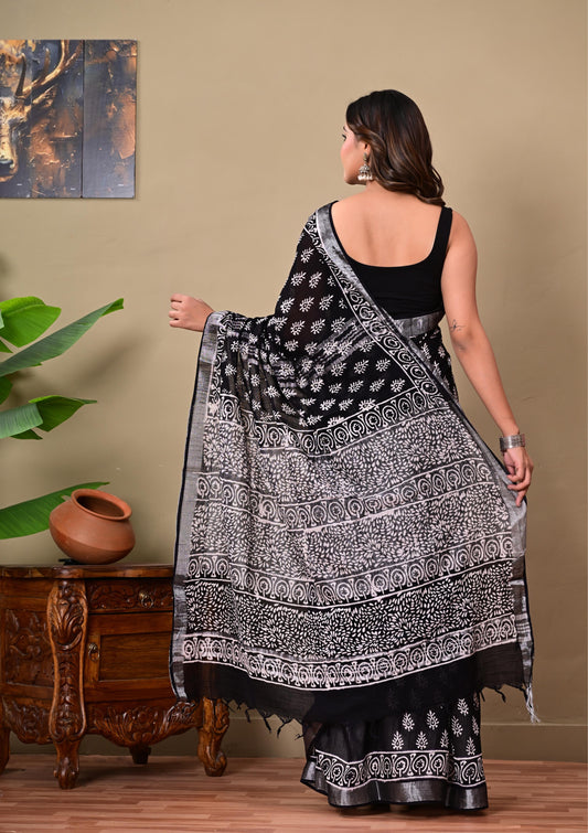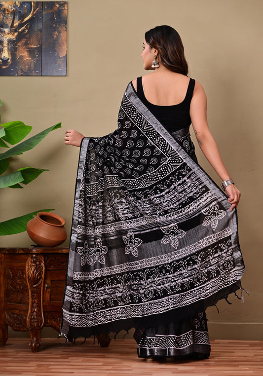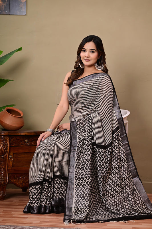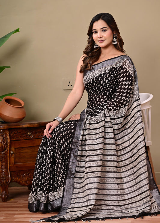 Block Printed Cotton linen Saree With Unstiched Blouse