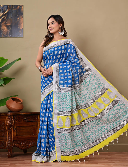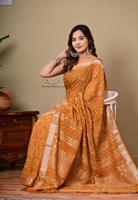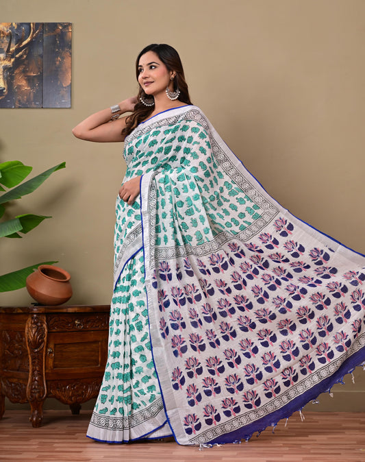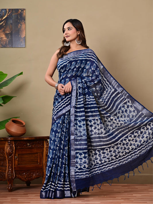 Block Printed Cotton linen Saree With Unstiched Blouse