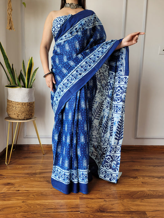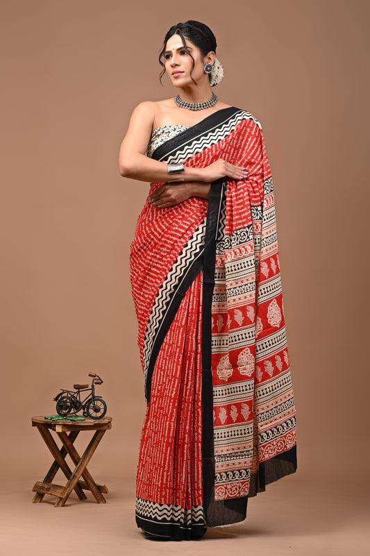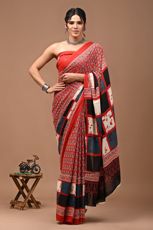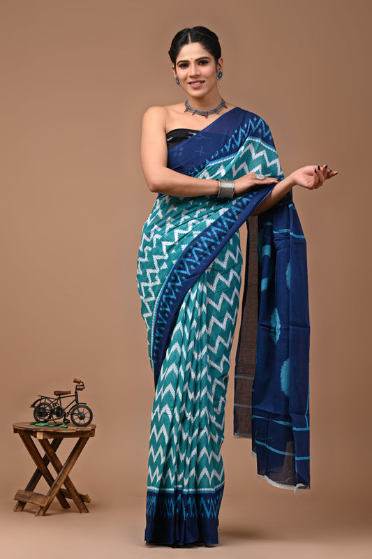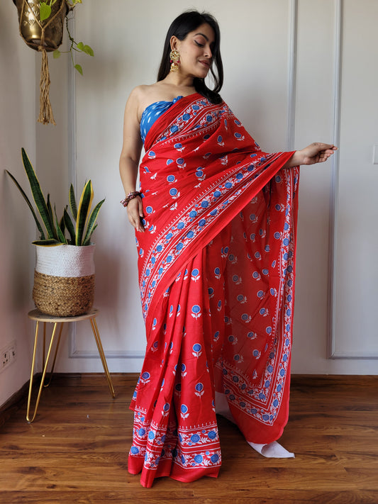 Jaipuri Printed Pure Cotton Mulmul Saree With Blouse