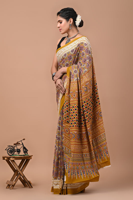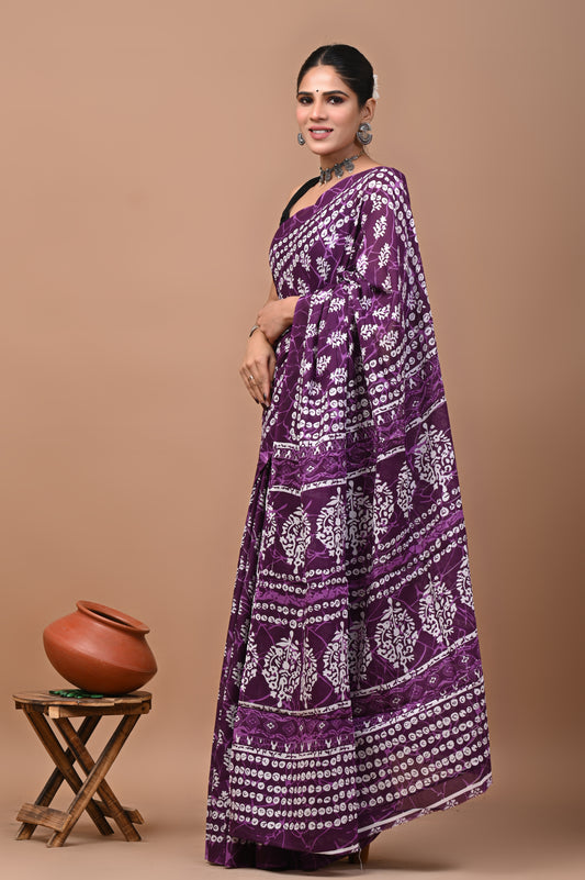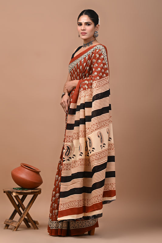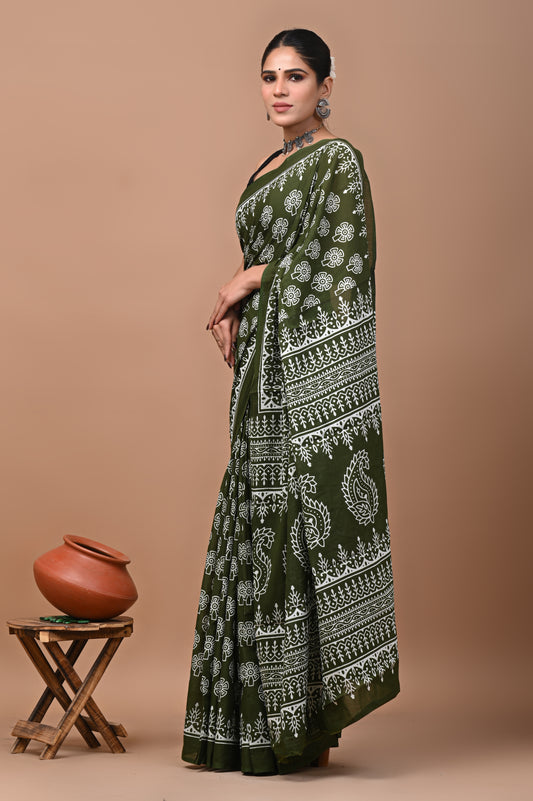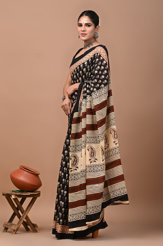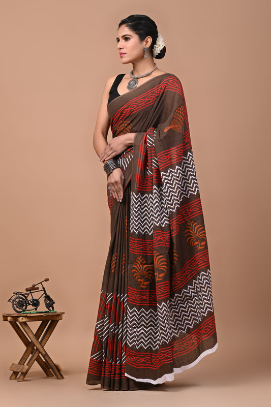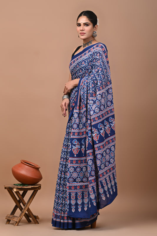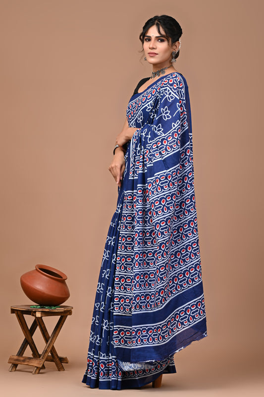 Jaipuri Printed Pure Cotton Mulmul Saree With Blouse