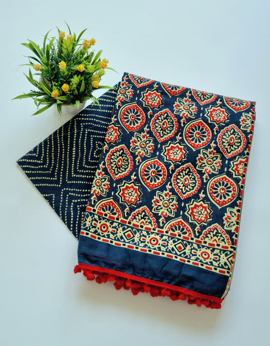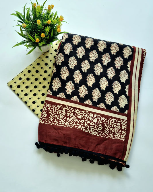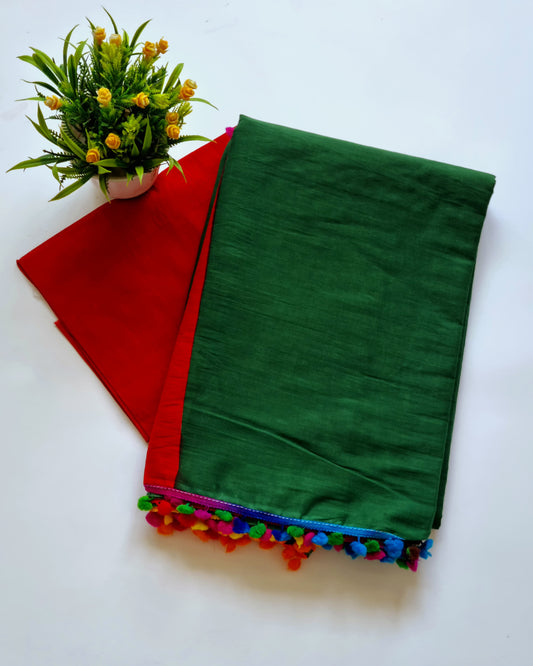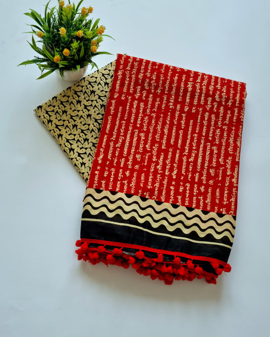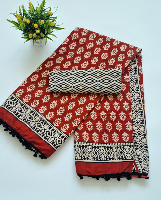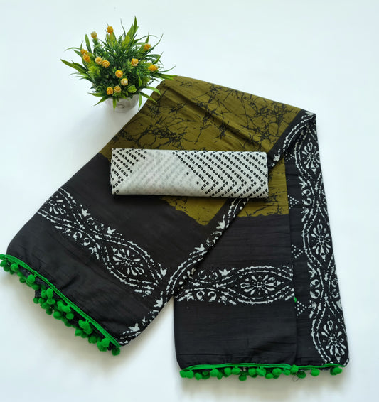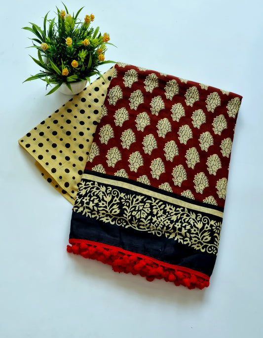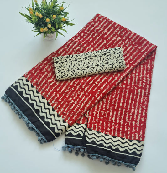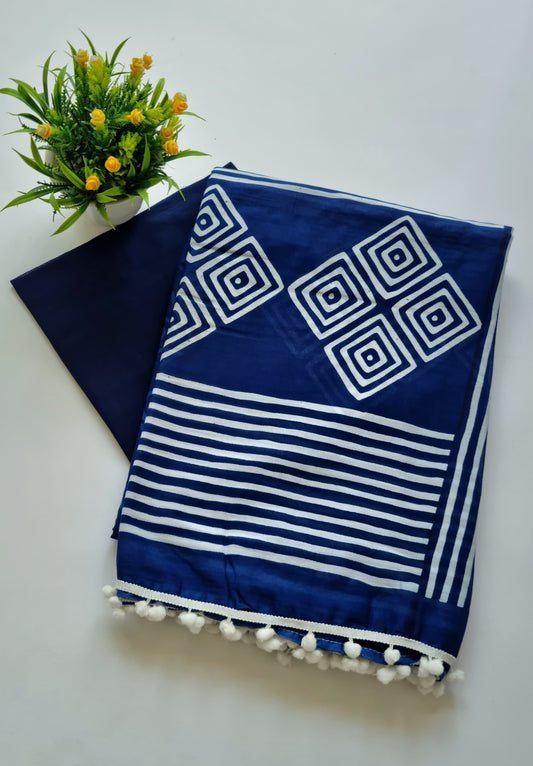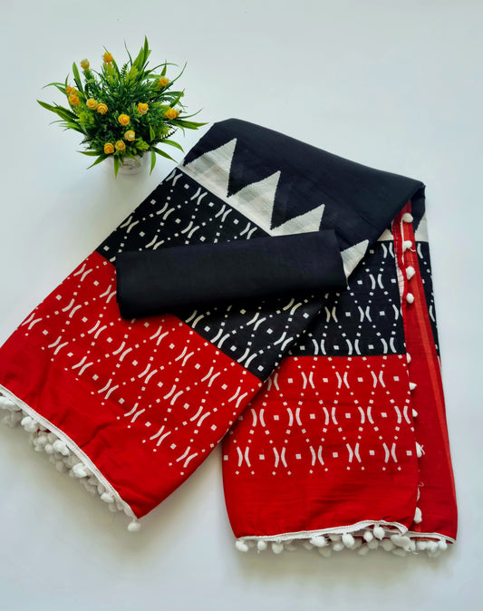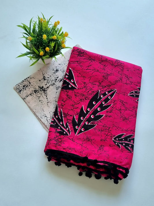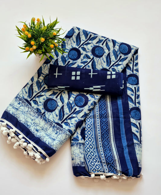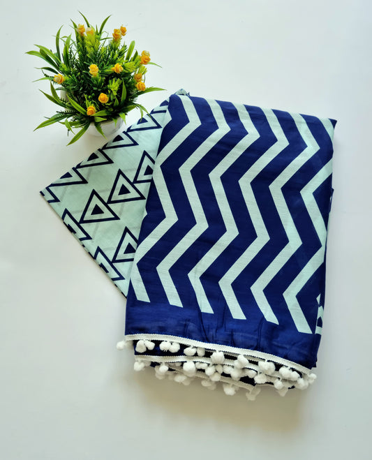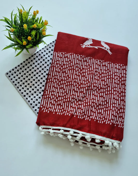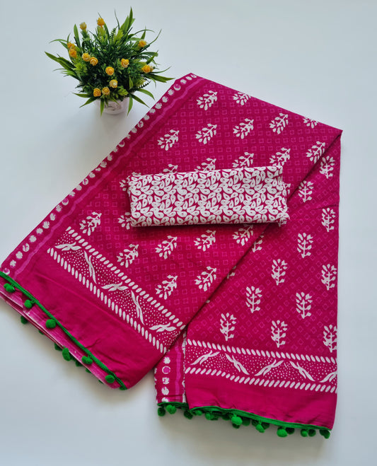Printed Pure Cotton Mulmul Saree With PomPom Lace