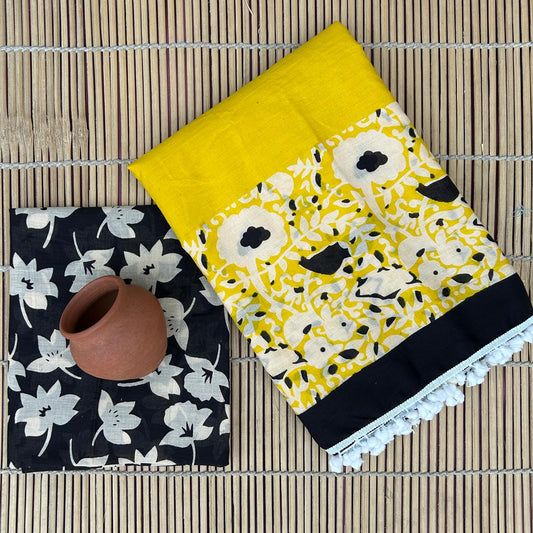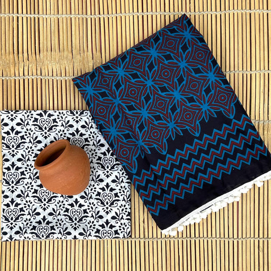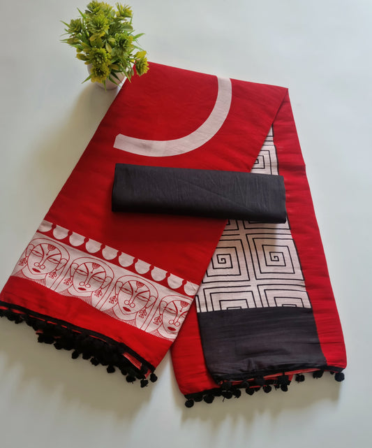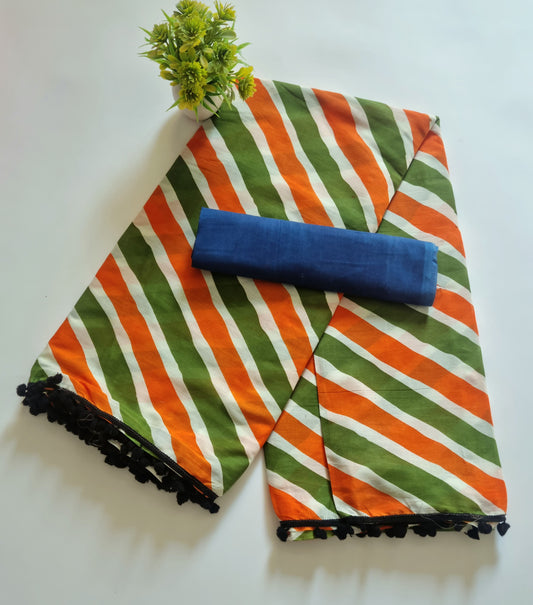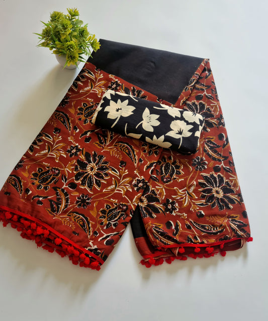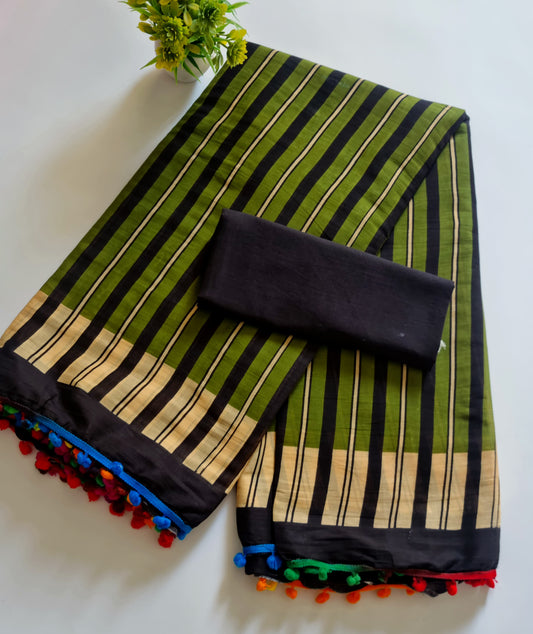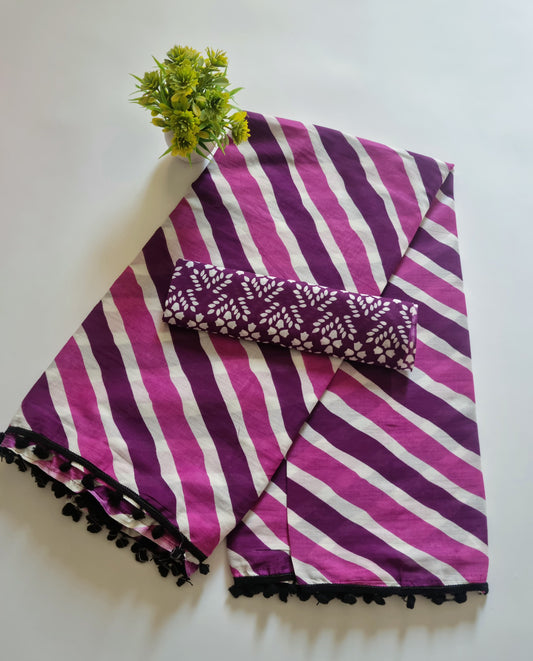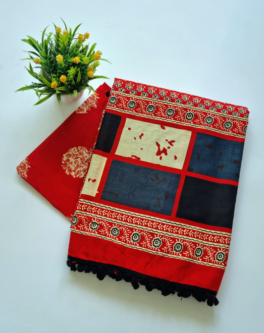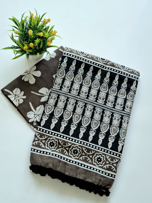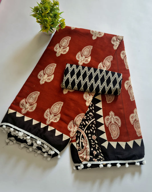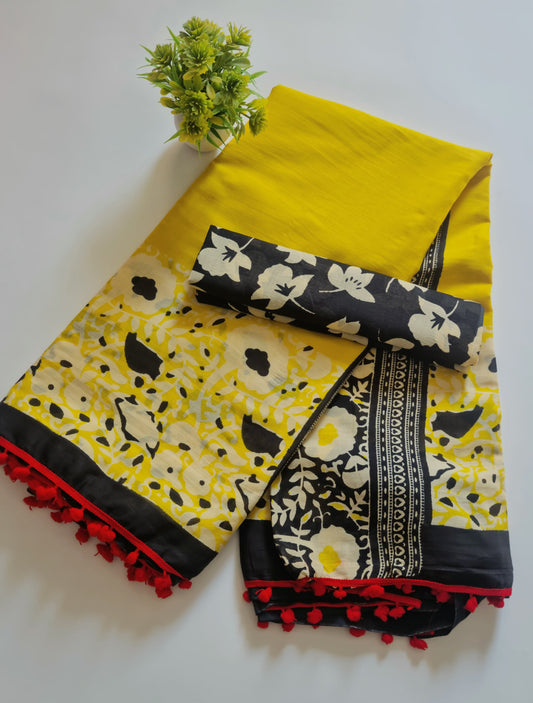 Printed Pure Cotton Mulmul Saree With PomPom Lace