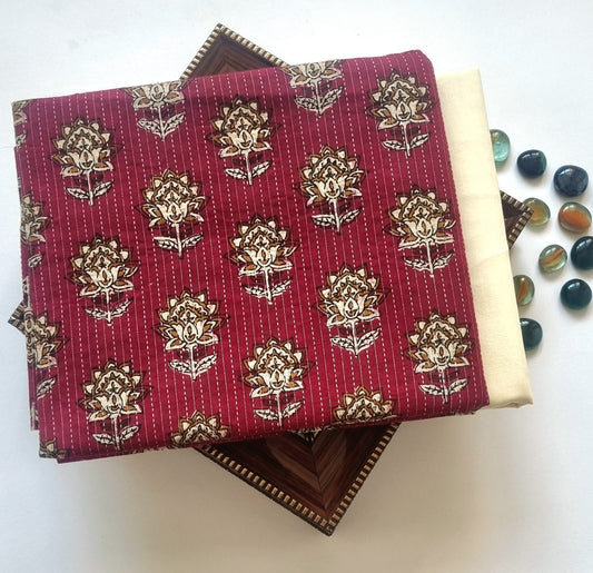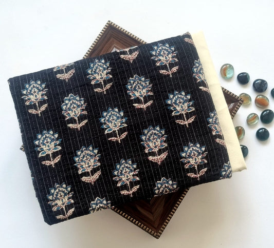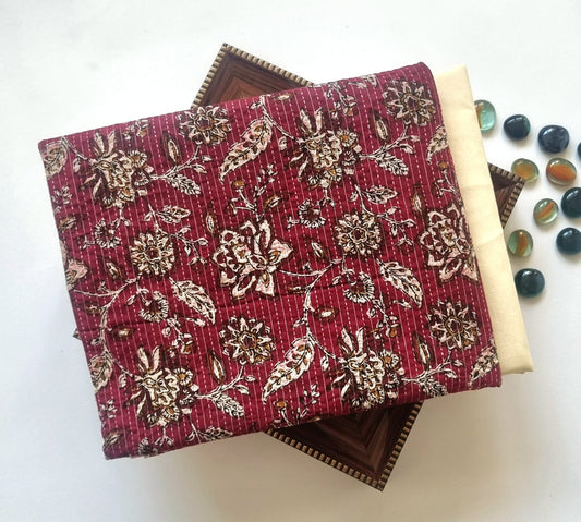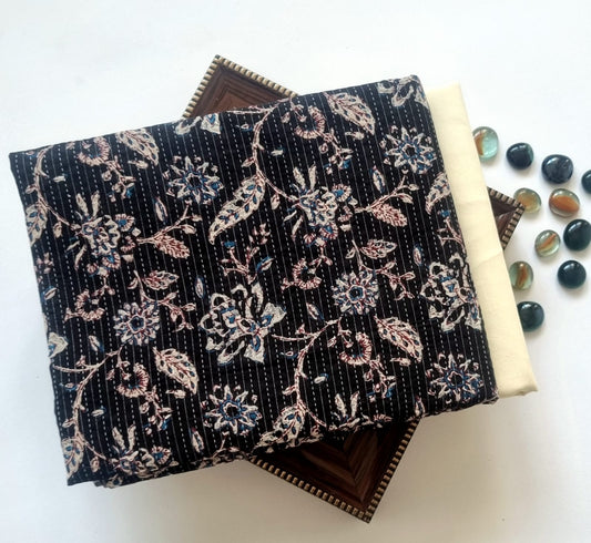 Pure Cotton Kantha Work Kurta Fabric (2.5 Meters) | and Plain Dyed Cotton Pyjama (2.5 Meters) | Unstitched Combo Set