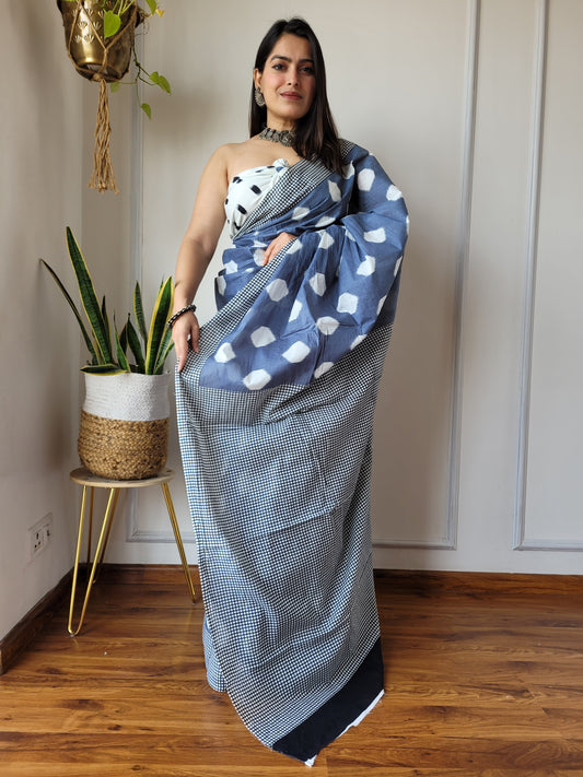 Block Printed Cotton linen Saree With Unstiched Blouse