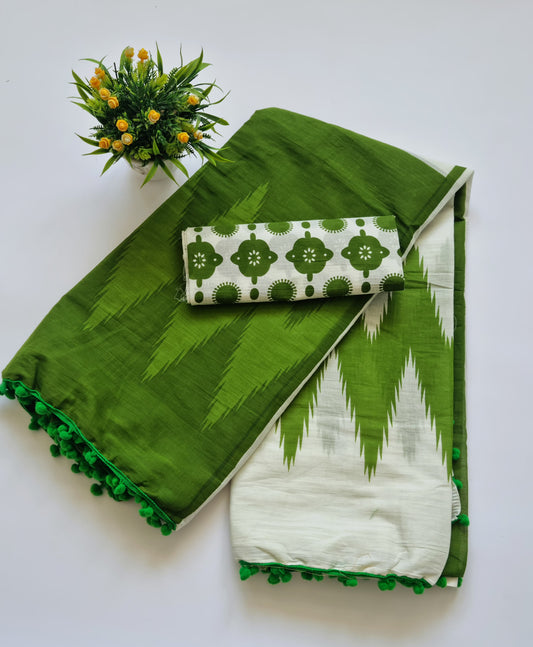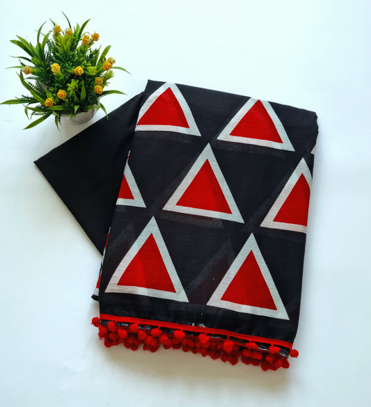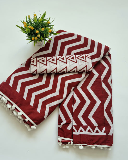 Printed Pure Cotton Mulmul Saree With PomPom Lace