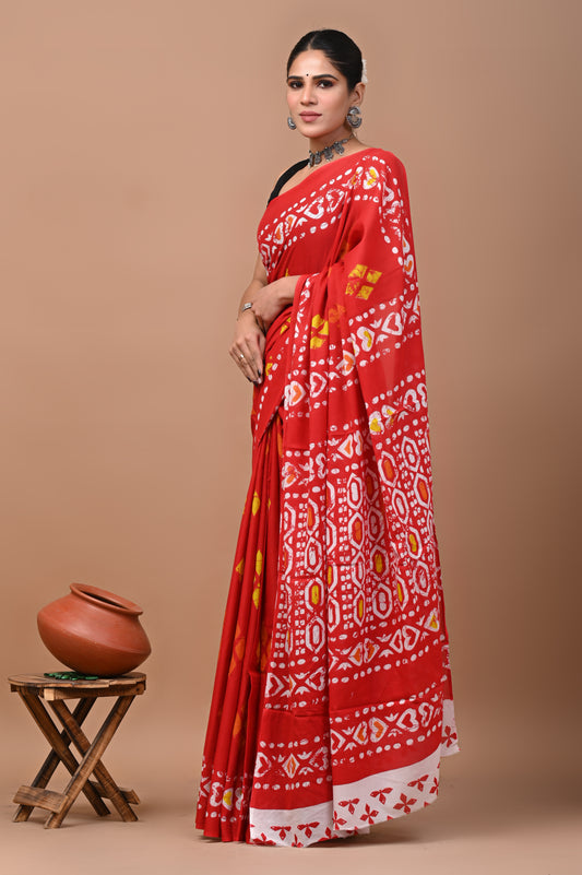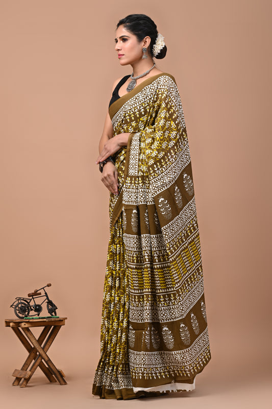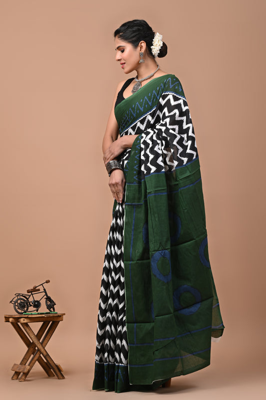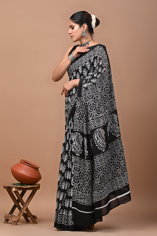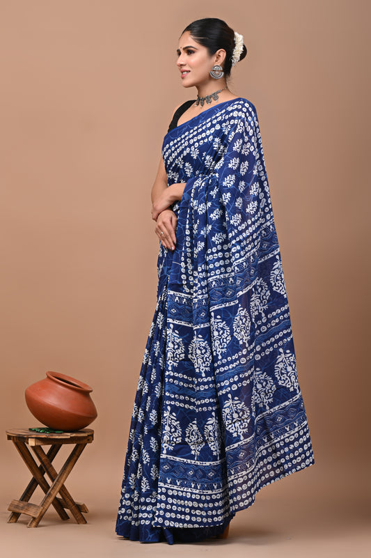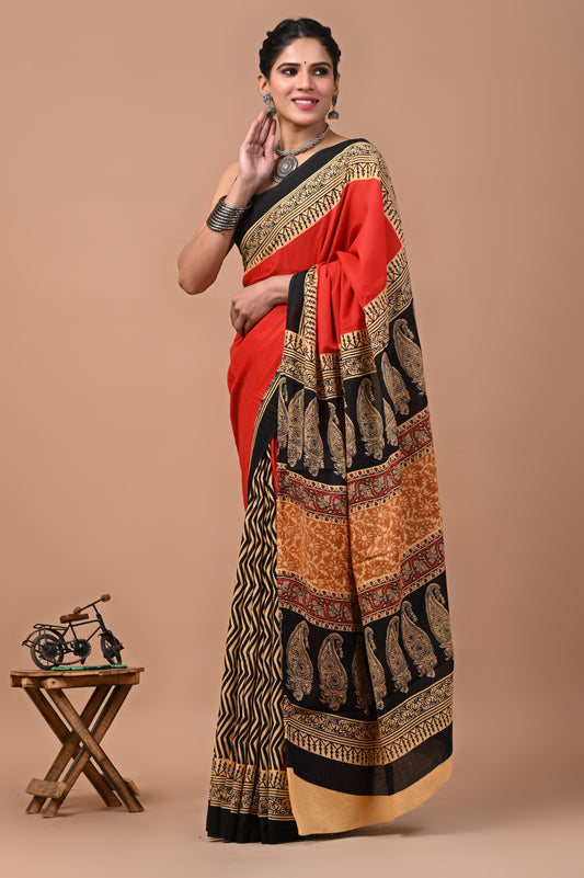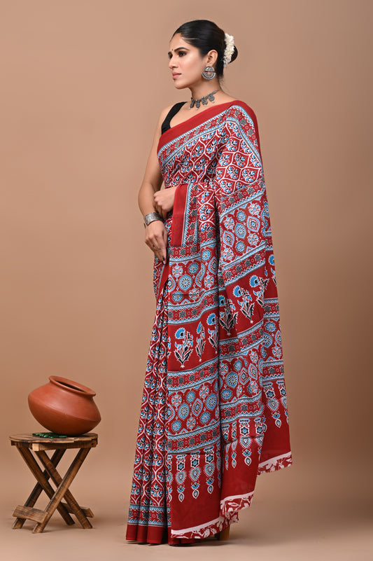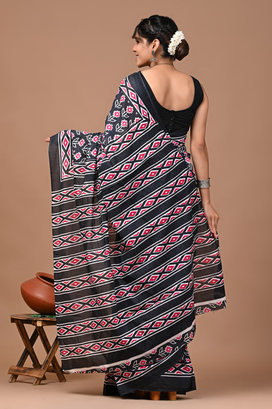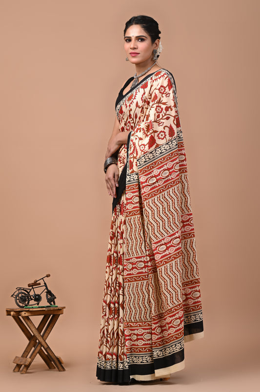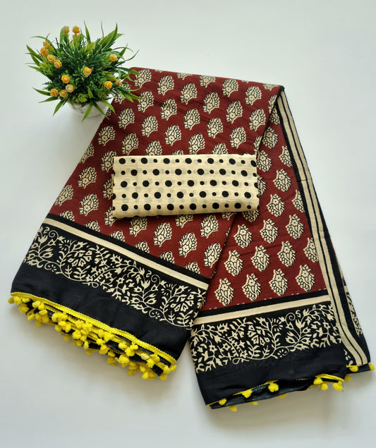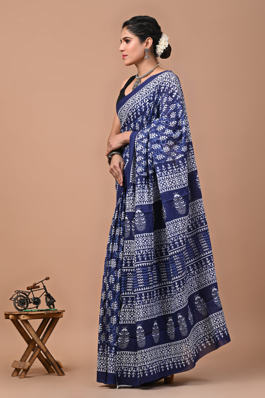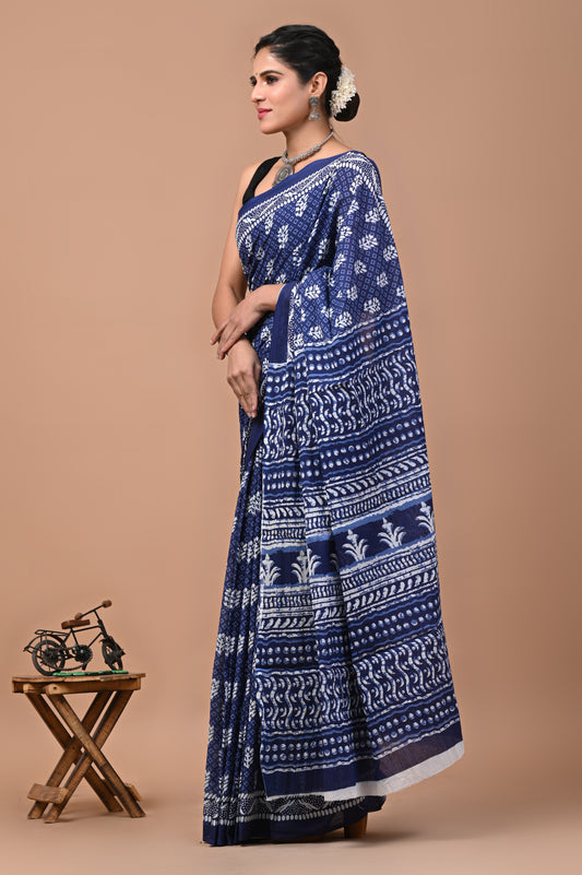 Jaipuri Printed Pure Cotton Mulmul Saree With Blouse
