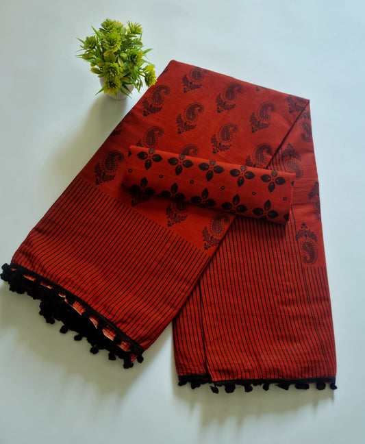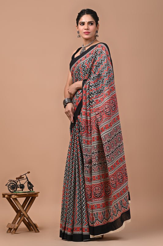 Plain linen Saree With Ajrak Printed Unstiched Blouse