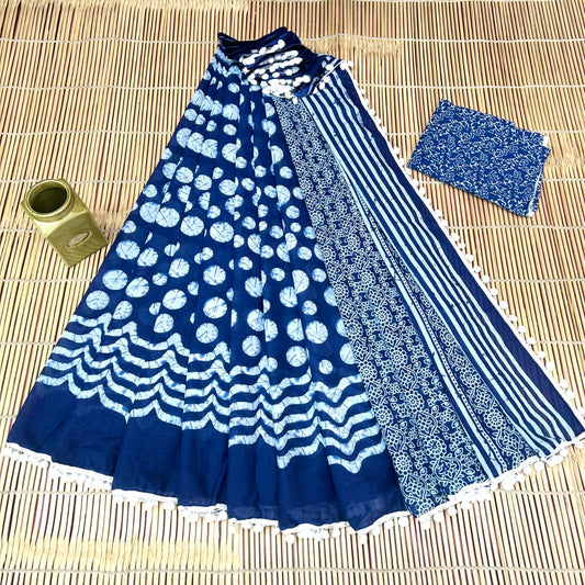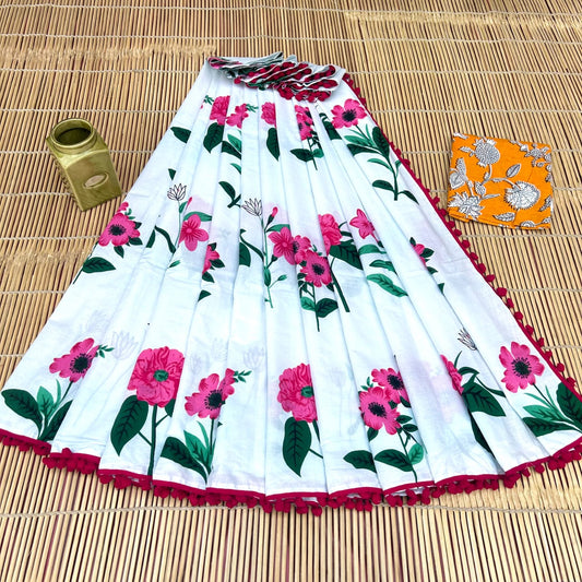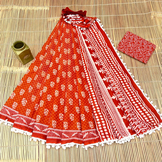 Printed Pure Cotton Mulmul Saree With PomPom Lace