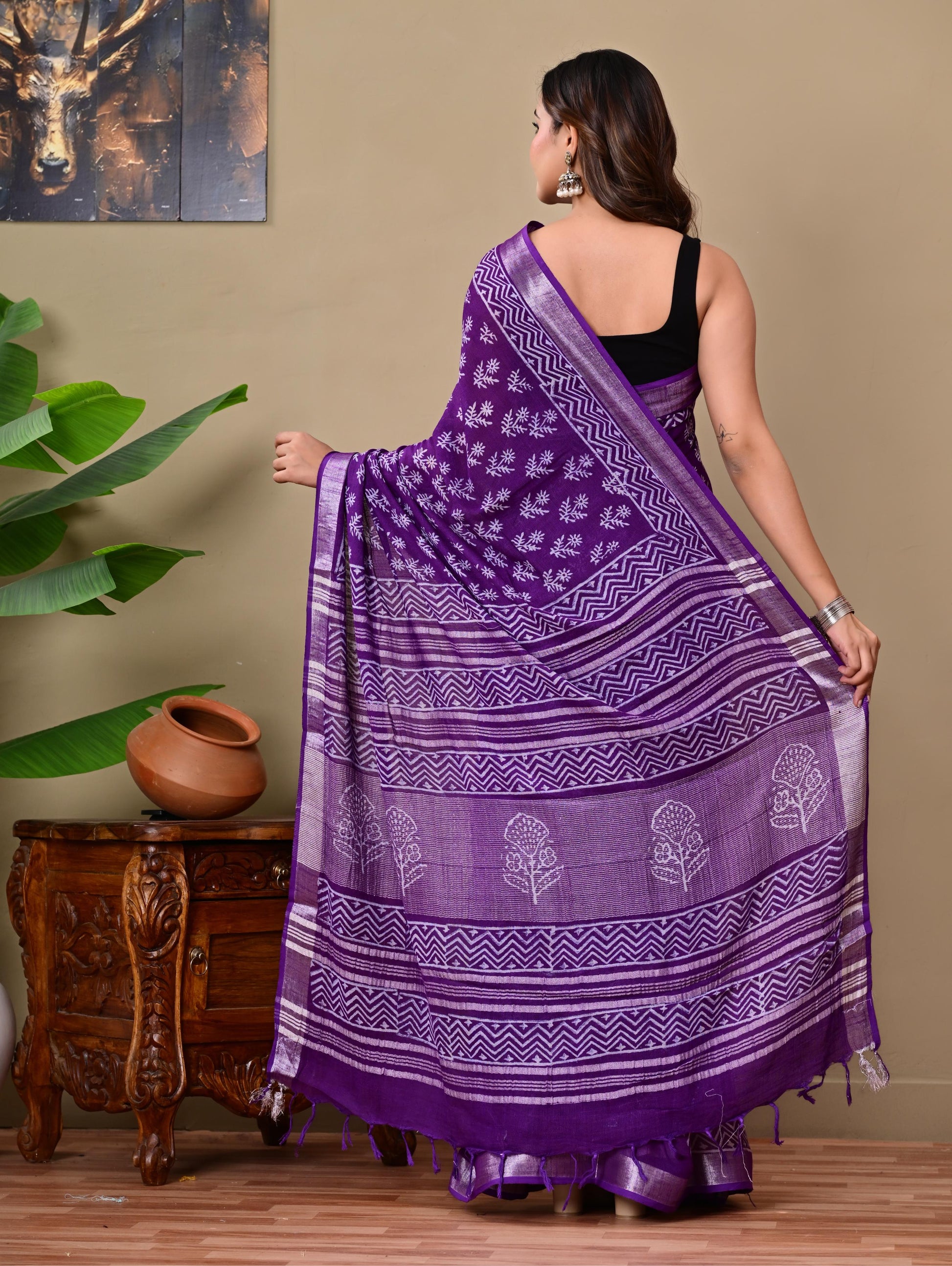 The Cotton Linen Printed Saree Coming with the Traditional Block Print Crafted by Indian Artisans