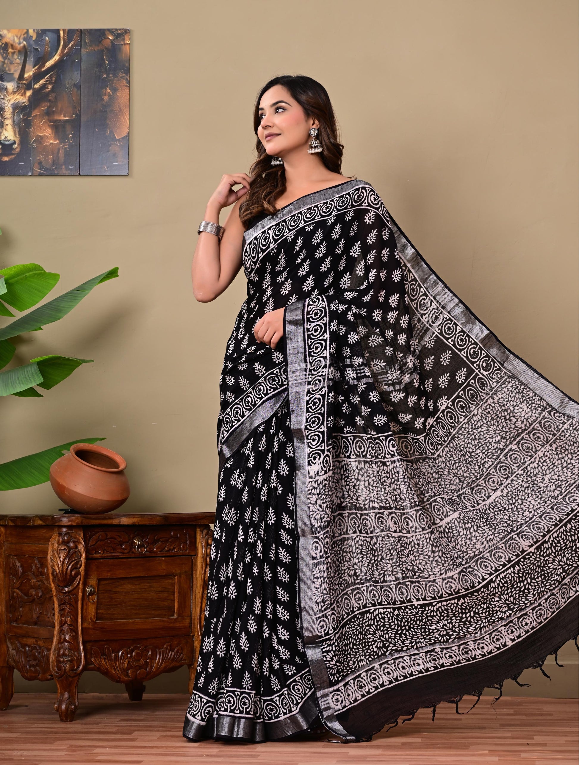 Block Printed Cotton linen Saree With Unstiched Blouse