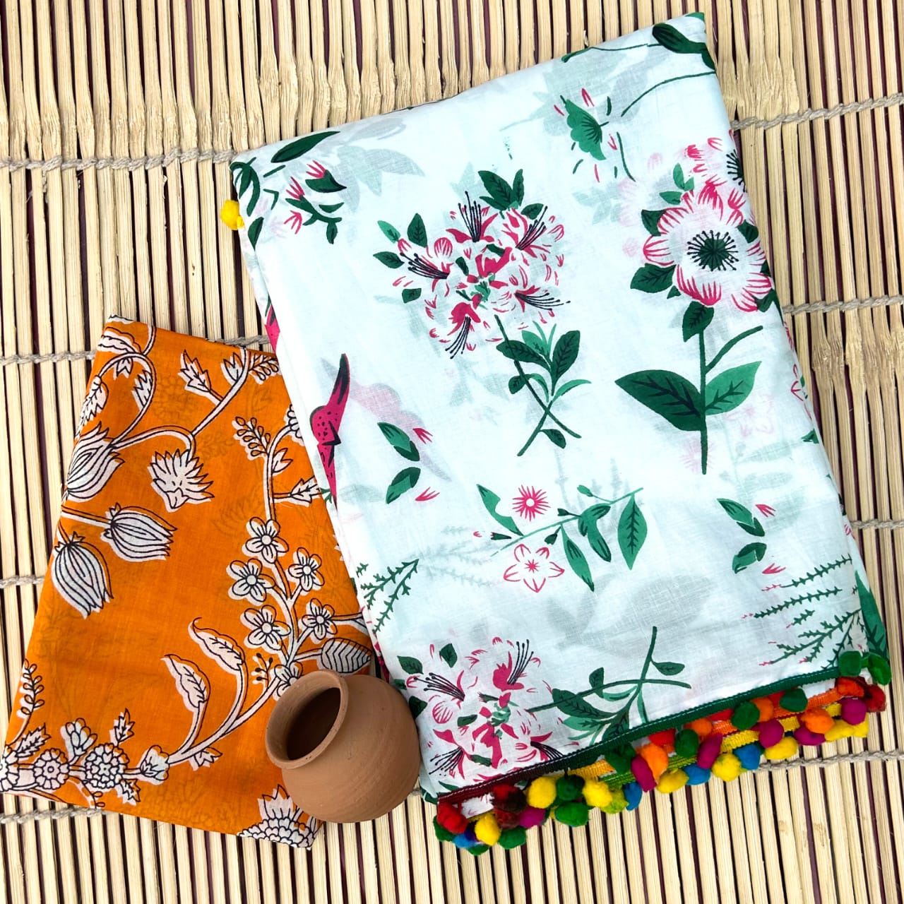 Printed Pure Cotton Mulmul Saree With PomPom Lace